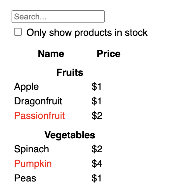Обратите внимание, что внутри ProductTable (фиолетовый) заголовок таблицы (“Name” и “Price”) сам по себе не является отдельным компонентом. Отделять его или нет — вопрос личного предпочтения. В данном примере он является частью ProductTable, потому что находится внутри списка ProductTable. Тем не менее, если в будущем заголовок пополнится новыми функциями (например, возможностью сортировать товар), вы можете извлечь его в самостоятельный компонент ProductTableHeader.